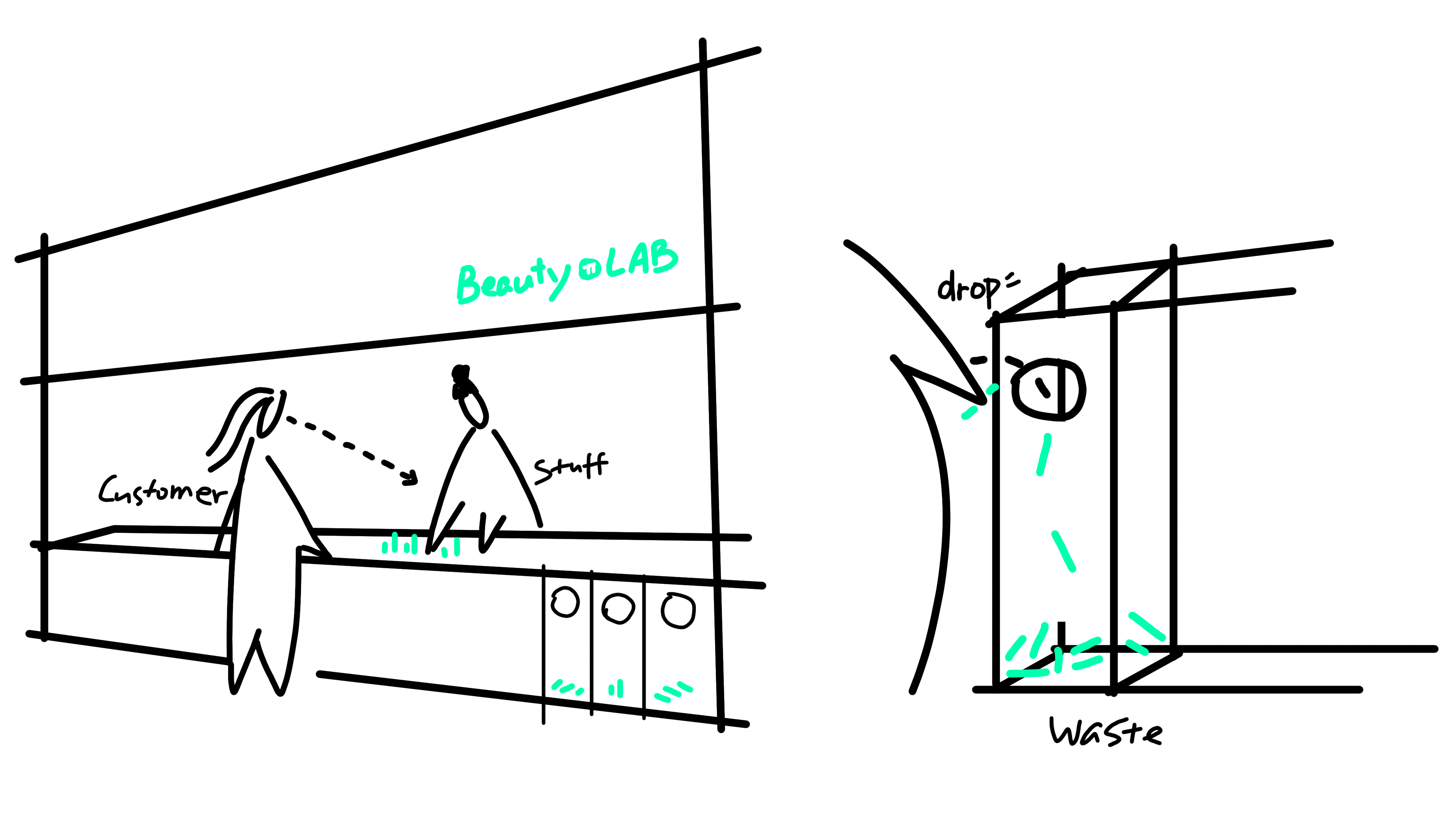 公开透明的调配是Beauty π 云朵白的体验特色,我们将前台、收银、调配间整合,并连接后勤空间,以LAB的形式成为大厅区域的主视觉。顾客可以从窗口看到疗肤精华调配的全过程,并在美容体验结束后,将未用完的精华带回家,或将空瓶投入吧台正面的投放口。动态灯箱播放的光影画面与户外阳光洒下的斑驳树影相呼应,并可以更换素材。