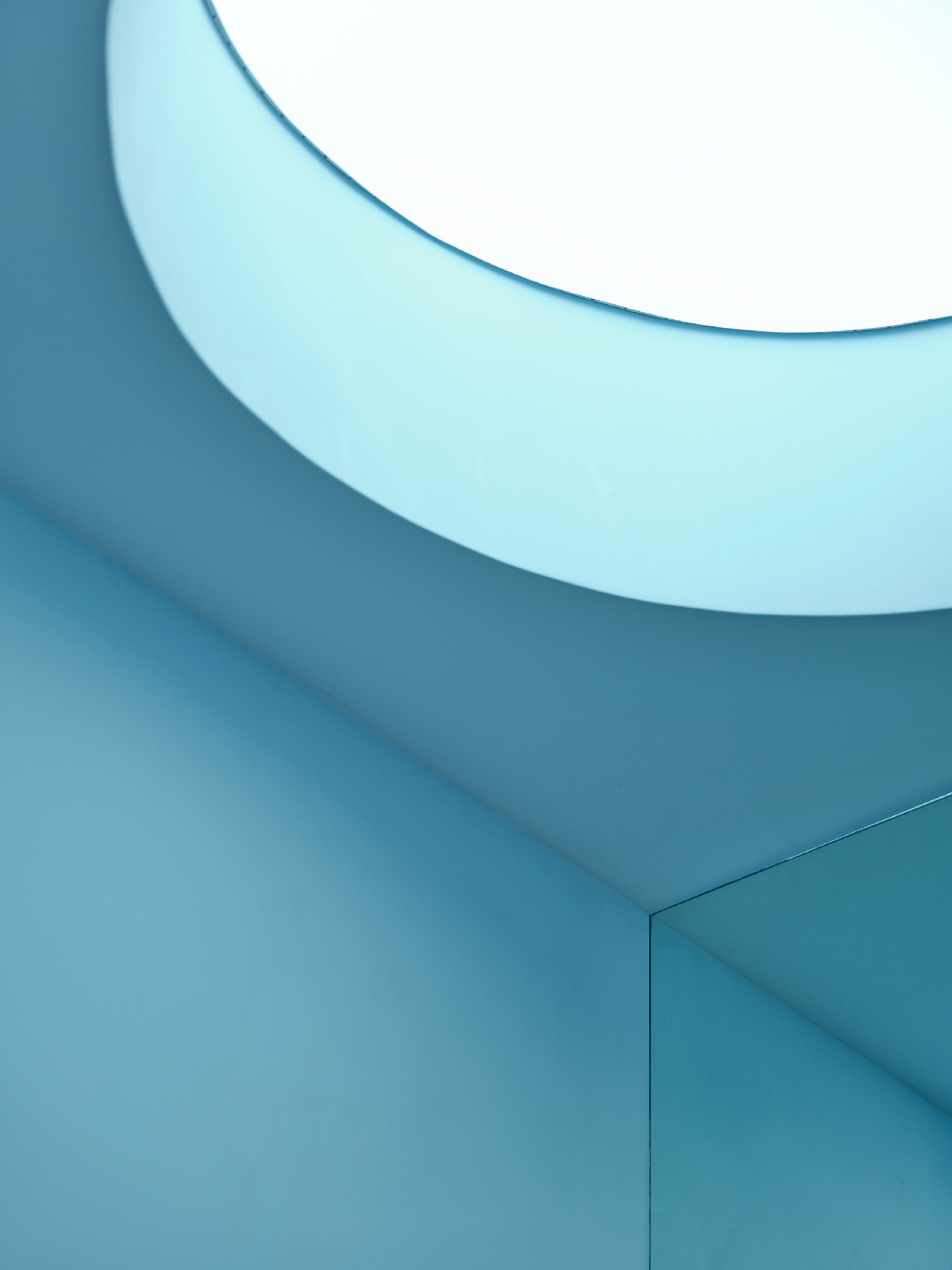 目前市面上大部分的美业空间都以米白、木色,黑白为主,国内尚无美业品牌占有强烈的空间色彩IP。因此我们决定大胆运用Beauty π 云朵白的VI色以抢占第一个空间色彩IP。主VI色应用于外立面及小部分室内空间,给人以绿色的第一品牌印象。辅助色蓝色大面积应用于室内公共空间,与绿色中和,达到自然、清爽、安静的感受。